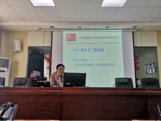 10月8日下午,校纪委书记俞贵邦给其所分管和联系的纪委办公室、督导处、审计处、外国语学院和体育教学部全体党员上党课。以“自觉守纪律,讲规矩,永做政治上的明白人”为题,谈在“不忘初心 牢记使命”主题教育中所学所思,与全体党员同学习、同思考、同提高。他指出:要深刻把握新时代党的纪律建设的跨越性发展;准确理解党的纪律规矩的丰富内涵;必须坚持发扬守纪律讲规矩的优良传统;要自觉守纪律、讲规矩,永做政治上的明白人;要不断增强遵守纪律规矩的自觉性和坚定性。